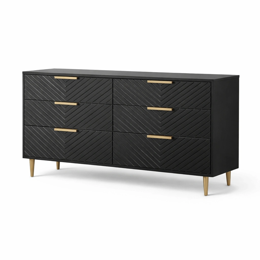 Die Kommode besteht aus massivem Holz mit chevron-gemusterten Schubladenfronten. Die Griffe und konisch zulaufenden Beine sind aus Metall gefertigt. Maße: 160 cm x 45 cm x 80 cm. Gewicht beträgt 45 kg. Verfügt über 6 Schubladen für großzügigen Stauraum.