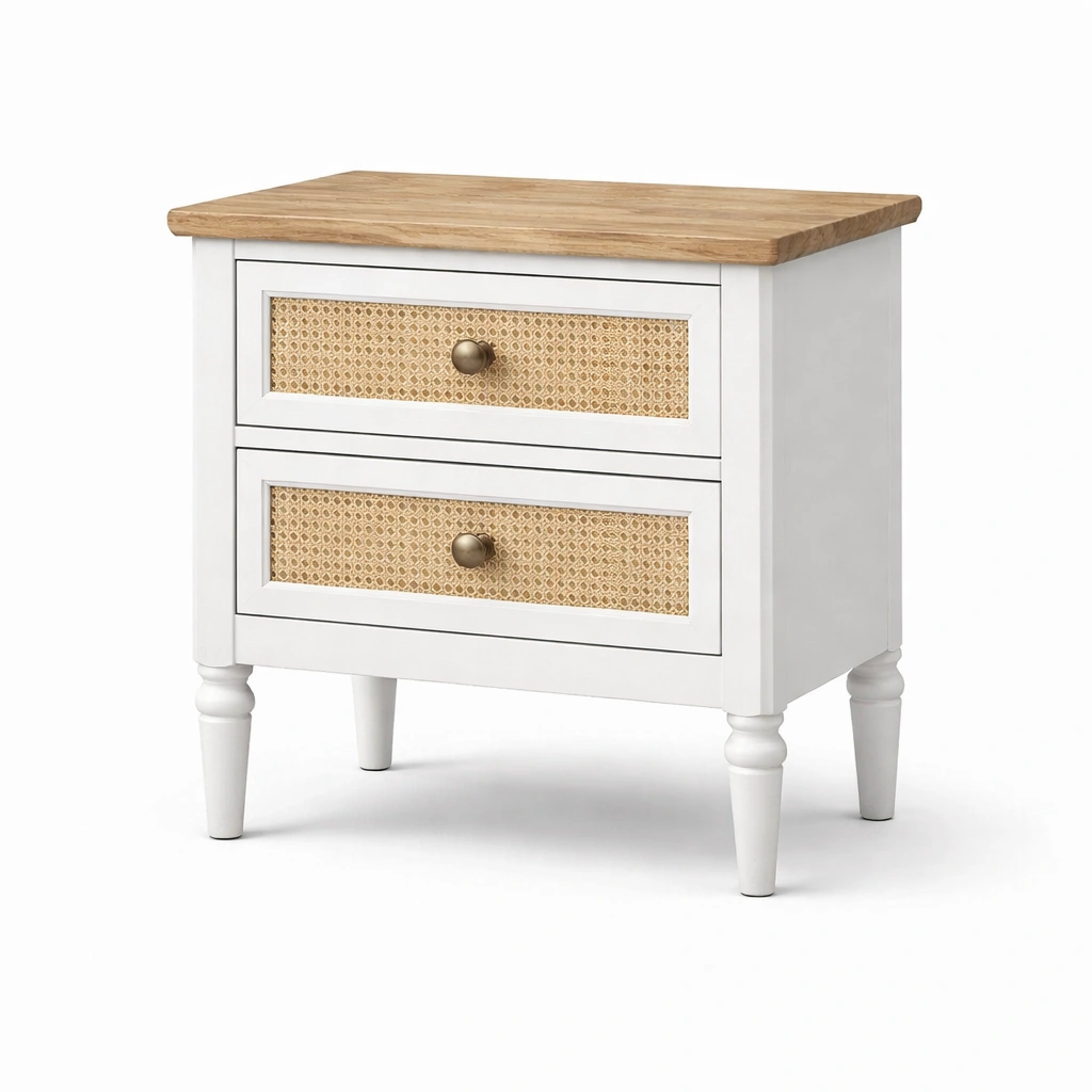 Materialien: Rahmen aus MDF, Oberfläche aus Eichenfurnier, Schubladenfronten mit Rattan