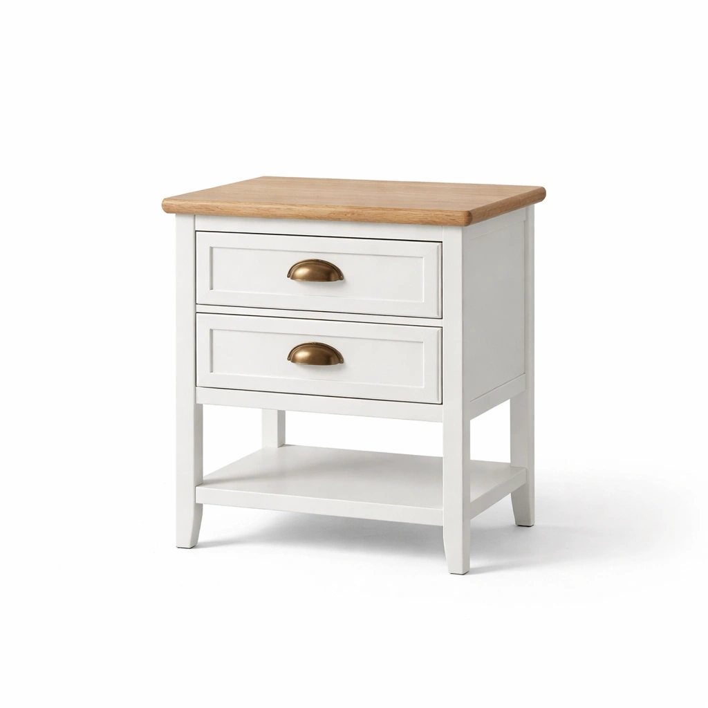 Material: Tischplatte aus Eichenholz, Korpus aus MDF, Griffe aus Metall.